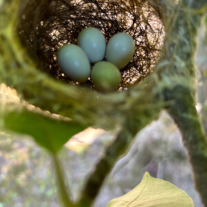 枝葉の奥をのぞくと…なんと、メジロの巣と卵を見つけました。こちらが気づくより先に、きっとずっとそこにいたんでしょうね。静かに、でも一生懸命に「いのち」を守っている姿に、現場の空気がふっと優しくなりました。