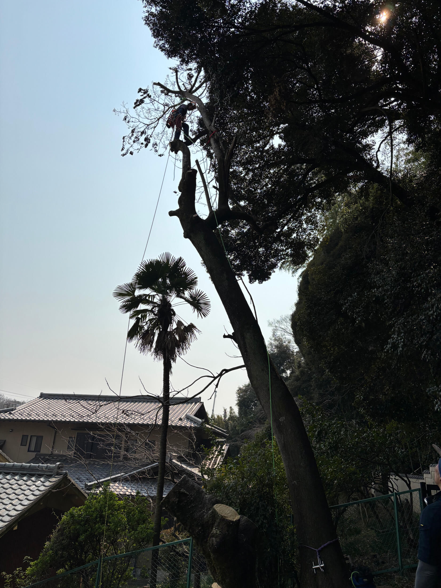 現場は斜面に生えており、さらに木の途中から腐食(腐朽)が進んでいる状態。樹木は外から見ると立っているように見えても、内部が傷んでいると強度が落ち、想定外の方向に割れたり倒れたりするリスクが高まります。しかも今回は近隣に住宅があり、「万が一」が許されない条件。通常の伐採よりも、倒す方向のコントロールと安全確保の段取りが重要な現場でした。