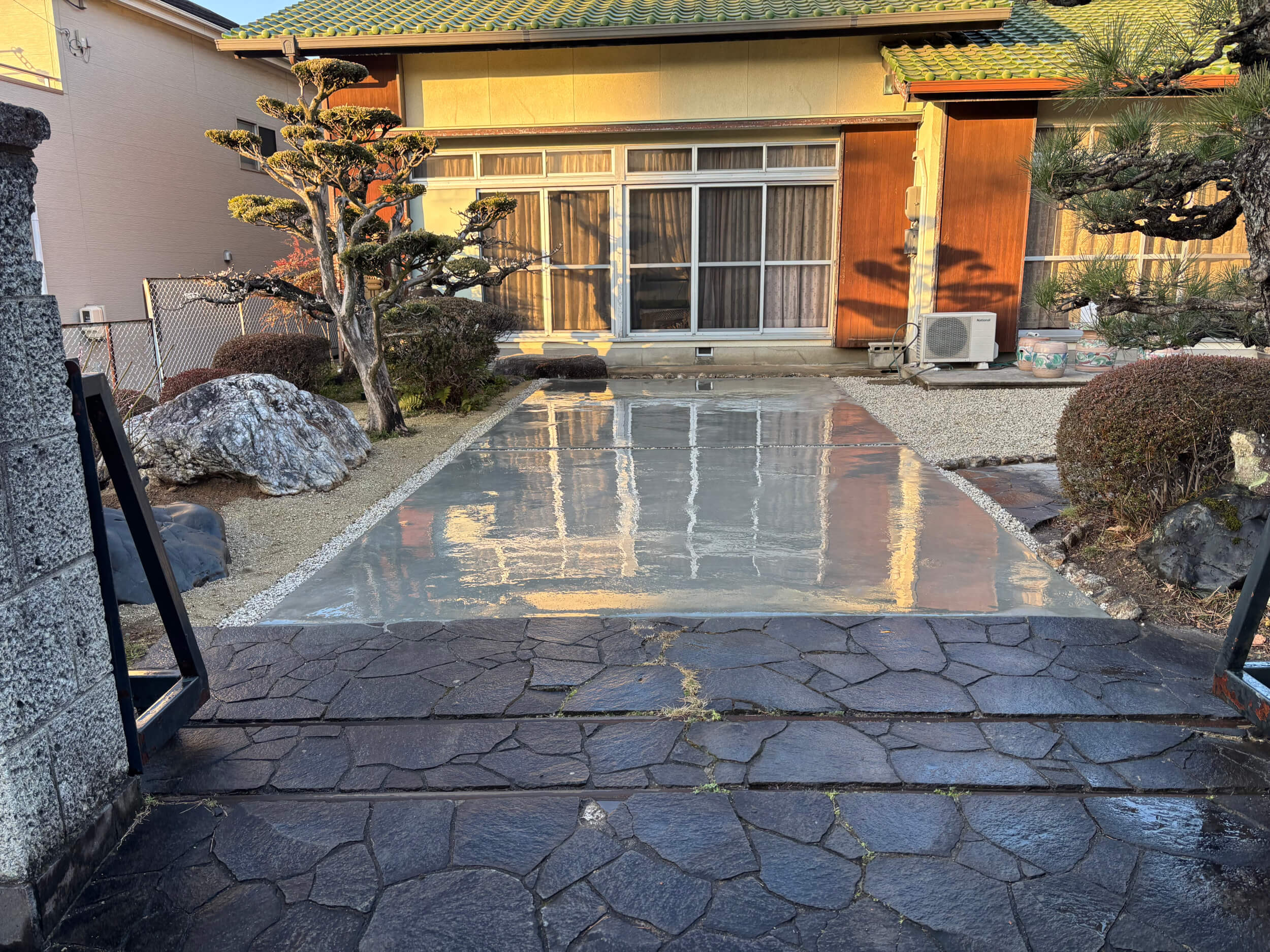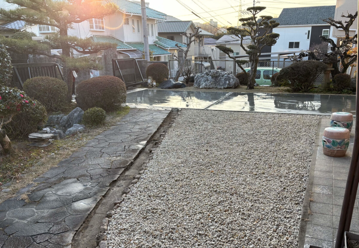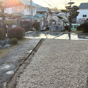 広いお庭は魅力ですが、その分、草取りや清掃の負担が大きくなりがちです。今回は防草対策も踏まえ、駐車スペースはコンクリートでしっかり確保し、周辺は砂利敷きで仕上げることで、日々の管理がしやすい外構へ整えました。和風のお庭の雰囲気を崩しすぎないよう、仕上がりの見え方や動線も意識しながら、使いやすさを優先しつつ“緑を感じる庭らしさ”も残すバランスを取っています。